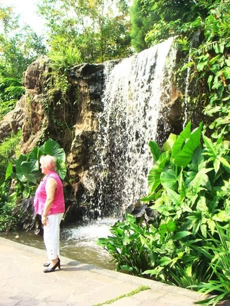 From the picture, even though the waterfall takes up a huge percentage of the picture, the brightness of the greens inevitably stands out as a whole. This untamed part of nature is probably the reason why it is ever dominant, even in the midst of a man-made dominant surrounding. Also visitors of the garden are seen posing to snap a picture of the gorgeous scenery. This however is most probably due to the attraction towards the beauty of the man-made waterfall, rather than the naturally grown surroundings.